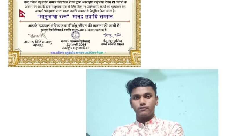 रायपुर (छत्तीसगढ़) के युवा साहित्यकार एवं मातृभाषा प्रेमी करन बघेल को अंतर्राष्ट्रीय स्तर पर प्रतिष्ठित “मातृभाषा रत्न” मानद उपाधि से सम्मानित किया गया है। यह सम्मान नेपाल सरकार में पंजीकृत संस्था शब्द प्रतिभा बहुक्षेत्रीय सम्मान फाउंडेशन, नेपाल द्वारा अंतर्राष्ट्रीय मातृभाषा दिवस (21 फरवरी 2026) के अवसर पर प्रदान किया गया। संस्था द्वारा मातृभाषा सेवा एवं भाषा संवर्धन के क्षेत्र में करन बघेल के उल्लेखनीय योगदान का मूल्यांकन करते हुए उन्हें यह प्रतिष्ठित अंतर्राष्ट्रीय सम्मान प्रदान किया गया। यह सम्मान कार्यक्रम काठमांडू (नेपाल) में आयोजित किया गया। इस उपलब्धि से रायपुर एवं आसपास के क्षेत्र में हर्ष का वातावरण है। परिवारजनों, मित्रों एवं साहित्य प्रेमियों ने उन्हें बधाई एवं शुभकामनाएँ दी हैं। करन बघेल ने इस सम्मान को अपने माता-पिता, गुरुजनों एवं समर्थकों को समर्पित करते हुए मातृभाषा के संरक्षण एवं प्रचार-प्रसार के लिए निरंतर कार्य करने का संकल्प व्यक्त किया।