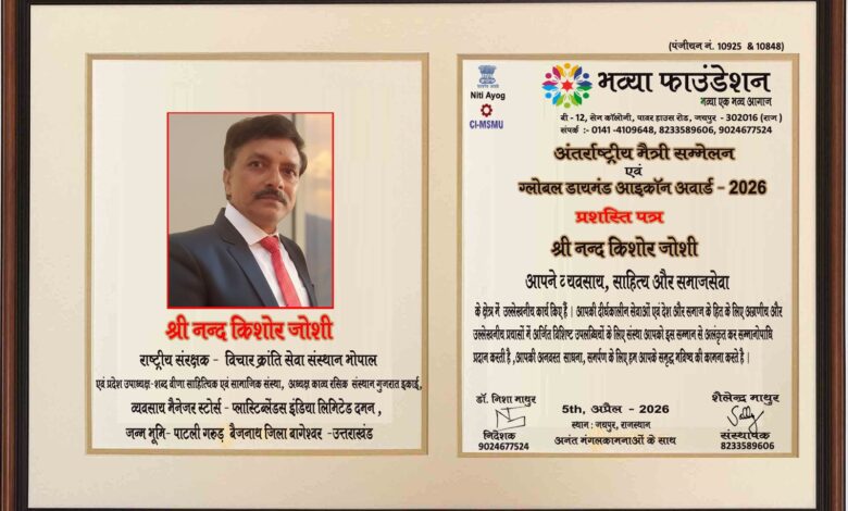 राज न्यूज 24 चैनल छत्तीसगढ़ सहसंपादक मुकेश कुमार राजपूत कि रिपोर्ट ग्राम पाटली गरुड़ जिला बागेश्वर उत्तराखंड हाल निवासी वापी गुजरात को भव्या फाउंडेशन द्वारा साहित्य के क्षेत्र में उत्कृष्ट योगदान के लिए समारोह में ग्लोबल डायमंड आइकॉन सम्मान जयपुर में देने की घोषणा। अंतर्राष्ट्रीय मैत्री सम्मलेन और ग्लोबल डायमंड आइकॉन अवार्ड -2026 में देश,विदेश और प्रदेश की 200 प्रतिभाओं को सम्मानित किया जायेगा, जिनमे निशक्त जन, कैंसर पीड़ित और आटिज्म वर्रिएर्स, बाल बसेरा गृह के बच्चों को भी सम्मानित किया जायेगा। इस बार भी इस प्रोग्राम में 15 देशों के अवार्डीज़ शामिल होंगे। इस रविवार 5th अप्रैल,2026 को भव्या फाउंडेशन के तत्वाधान में कैंसर पीड़ितों और ऑटिस्टिक और विशेष योग्यजन बच्चों को समर्पित अंतर्राष्ट्रीय मैत्री सम्मलेन और ग्लोबल डायमंड आइकॉन अवार्ड -2026 समारोह का आयोजन रविवार सुबह 10.00 बजे से सुरेश ज्ञान विहार यूनिवर्सिटी- जगतपुरा - जयपुर के कालिंदी ऑडिटोरियम में संपन्न किया जायेगा। जिसमें देश, विदेश और प्रदेश के विभिन्न क्षेत्रों में विशेष मुकाम हासिल करने वाले 200 प्रतिभाओं को सम्मानित किया जायेगा । जिसमें सोबन सिंह जीना विश्वविद्यालय परिसर अल्मोड़ासे के विभागाध्यक्ष प्रो.(डॉ)शेखर चंद्र जोशी को भी सम्मानित किया जाएगा। जो कि विशिष्ट अतिथि भी हैं। भव्या फाउंडेशन के संस्थापक शैलेन्द्र माथुर और निदेशक डॉ. निशा माथुर ने जानकारी दी। इस समारोह में पूरे देश भर से कई विशिष्ट अतिथि शिरकत करेंगे। प्रो(डॉ)शेखर चंद्र जोशी ,विभागाध्यक्ष के अलावाऔर भी कई गणमान्य अतिथि उपस्थित होंगे । इस प्रोग्राम में डॉ. नीता शर्मा - मिसेज इंडिया -2022 (फर्स्ट रनर अप ), मिस परमिला बेदी -मिस इंडिया यूनिक, मिस माधुरी विष्णु गोवलकर, सुरभि माथुर और वान्या श्रीवास्तव, द्वारा – डॉ. प्रियंका जैन, श्रीमती शुभा शुक्ला, श्रीमती उषा सिंह, मिसेज अर्पणा राज, मिस संस्कृति दीक्षित, डॉ. रूचि सक्सेना, मिस शुभांशी शुक्ला, डॉ. सुमिता राय, श्रीमती रूचि तोमर, नेहा कुमारी को भव्या फाउंडेशन के ब्रांड एम्बेसडर का ताज पहनाया जायेगा । चित्रा माथुर फाउंडेशन के सौजन्य से कुछ जरुरतमंद महिलों को सिलाई मशीन भी दी जाएगी। इस प्रोग्राम में कई साहित्यकारों की पुस्तकों का विमोचन भी होगा...प्रोग्राम का संचालन एंकर RJ सपना (आकाशवाणी) करेंगी । समारोह में साहित्य, पत्रकारिता,समाज सेवा, शिक्षा, कला, ज्योतिष, उद्यम, कृषि, फिल्म, फैशन, ज्योतिष व अन्य क्षेत्र में अपने मन, लगन और हिम्मत से विशेष मुकाम हासिल करने वाली प्रतिभाओं को सम्मानित किया जायेगा।
